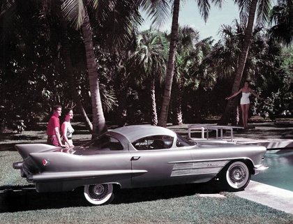 El Camino is short for the Spanish el camino real, the Royal Highway, alias US highway 101. The exhaust configuration, windshield, roof saddle, spoked wheels, quad headlights, fluted side panel, gull-wing bumpers with bullet tips all turned up the following year on the production prototype for the Eldorado Brougham; the shape of the tail-fins [as used also on the Cadillac La Espada roadster, below], turned up on the production Eldorado models of 1955, 1956, the Eldorado Brougham of 1957-1958 and the standard 1958 Cadillac production models. The pointed bullet-shaped, gull-wing front bumper was shared with many Cadillac show cars of the period; the bullets were sometimes rubber tipped; these rubber tips [I call them the Dagmar bra] appeared on stock Cadillac models in 1957 and 1958. El Camino was finished in silver-gray and featured a brushed stainless-steel roof.
